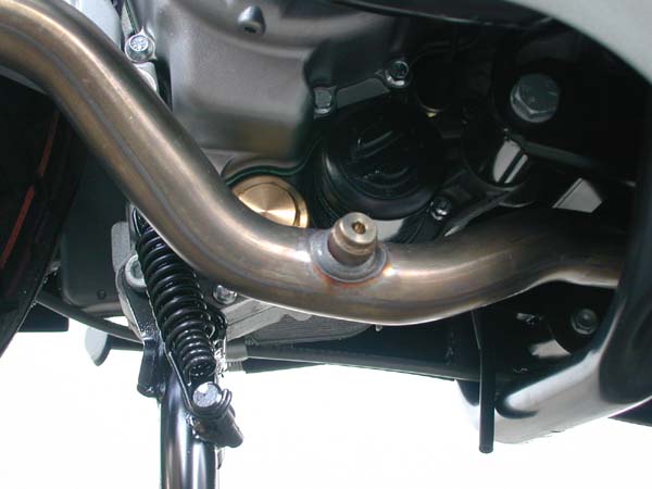 エキパイの後ろに見えているのがエンジンオイルのドレンボルトとオイルフィルター。