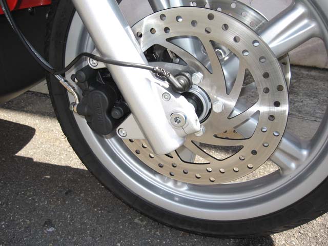 フロントブレーキ。ダブルディスクで制動力は十分。左のブレーキレバーで前後同時に効くインテグレーテッドブレーキシステム。