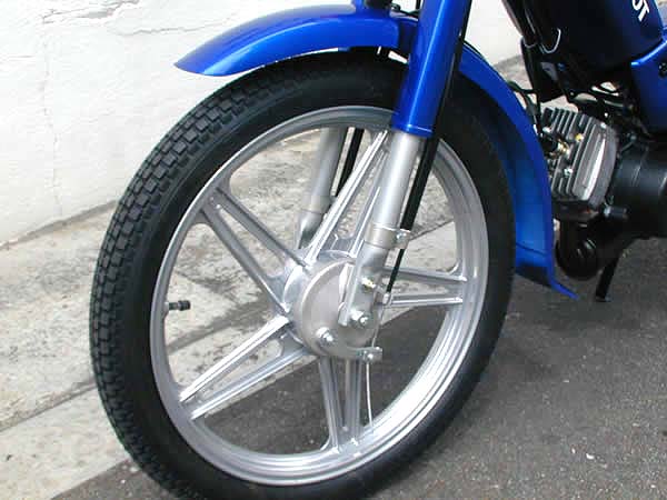 2002年モデルからの特徴であるキャストホイル。形状は2001年モデルのMVLと同じだがサイズが16インチである。チューブレスになりそうであるが現状ではチューブタイプのタイヤが付いてくる。タイヤはユッチンソン製、若干エアーが減りやすいのでこまめに空気圧のチェックをすること。(1ヶ月ぐらいおき)
