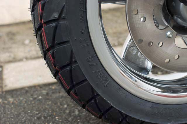 フロントタイヤ。120/70−12。サイズとしては非常に一般的でどこのメーカーでも必ずラインナップされているはず。