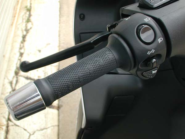 最近のスクーターの中ではかなり細め。スイッチ類はほぼ一般的なレイアウトだがパッシングだけがブレーキレバー側に独立して付いている。
