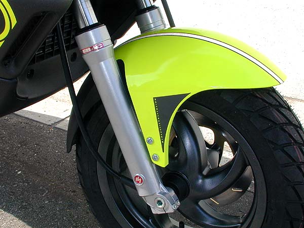 フロントタイヤは120−70/12。この車体に付いていたのはスロバキアのSAWA製。ホイルもマットブラックに塗装されている。